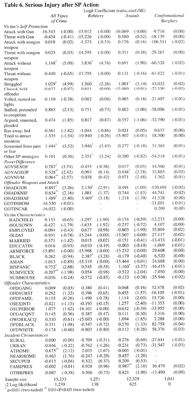Artykuł H-S jest pod wieloma względami uderzająco podobny do najbardziej wyczerpującej (w sensie rezerwuaru zgromadzonych danych i mnogości wplecionych kontekstów) analizy zjawiska DGU, jaką kiedykolwiek przeprowadzono, tzn. do publikacji Tarka & Klecka. Obie prace bazują na identycznych źródłach, definiują zmienną endogeniczną jako „post-SP injury” (obrażenia nabyte chronologicznie po wszczęciu czynności obronnych – dalej będę posługiwał się akronimem PSPI), ograniczają się tylko do przestępstw, w których potwierdzono bezpośredni kontakt ofiary z agresorem (przemoc, włamania i kradzieże uliczne), oraz podpierają się w estymacjach modelem regresji wielorakiej. Biorąc pod uwagę przytoczone analogie, czemu rezultaty otrzymane przez duet H-S różnią się od konkluzji T-K?