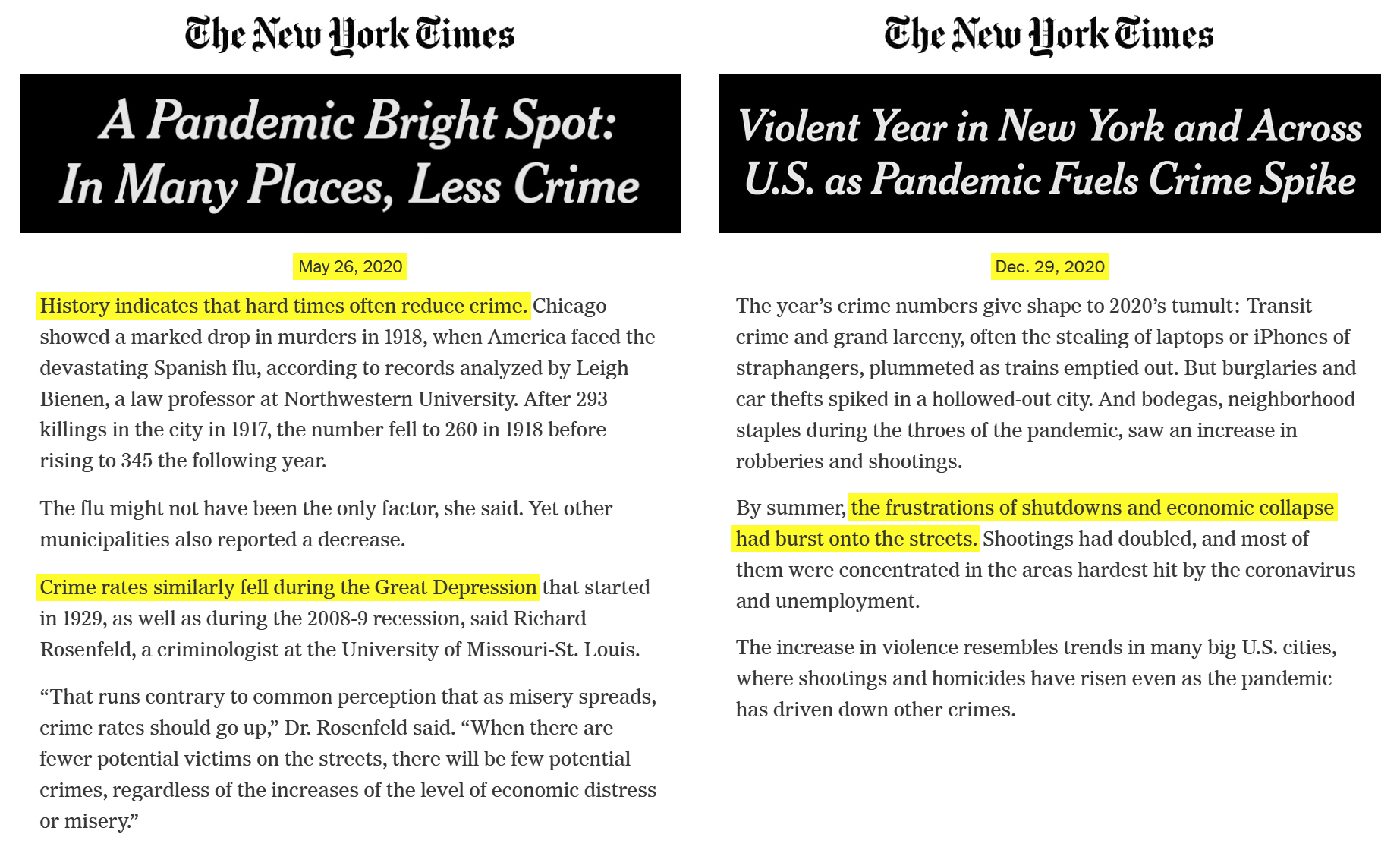 [1] W artykule z maja pisali, że „ciężkie czasy”, „kryzysy ekonomiczne” i „choroby zakaźne” obniżają przestępczość. Nie minęło pół roku, przestępczość osiągnęła rekordowe rozmiary, więc w grudniowym tekście dyskretnie zmienili wykładnię wydarzeń. Te same nieszczęścia, które na wiosnę sprzyjały wyhamowaniu przemocy, teraz zaczęły ją potęgować. Skąd ta wolta? Proste: po okresie wakacyjnym główne media w USA zdały sobie nieuchronnie sprawę, że trzeba jakoś przypudrować zgliszcza pozostawione przez ruch BLM. Zwalenie winy na „ekonomię”, pandemię i broń palną pozwoli odsunąć cień podejrzeń od czarnych celebrytów, ich wzniosłego, rasowego aktywizmu oraz rozmaitych lewoskrętnych inicjatyw społecznych, które wdarły się przebojem do mainstreamu po 26 maja.