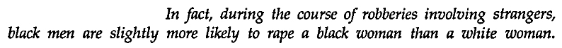 Otóż w streszczeniu referatu F&S oświadczyli, że w przypadku rozbojów z udziałem obcych ludzi ryzyko, iż murzyński bandzior wykorzysta seksualnie swoją ofiarę jest – uwaga – tylko odrobinę większe dla kobiet czarnych niż białych (link). Co ciekawe, na późniejszym etapie, w paragrafie podsumowującym, fraza „slightly more likely” przekształciła się magicznie w zwrot „significantly more likely” (link), sugerując, że ryzyko stało się nagle istotnie większe. Ale nie w tym rzecz – nie zamierzam kłócić się o semantykę ani wytykać niespójności. Chodzi mi o to, że F&S użyli ad hoc napadów rabunkowych jako papierka lakmusowego do sprawdzenia, czy czarni gwałciciele preferują białoskóre kobiety. Po przeprowadzeniu kilku banalnych regresji stwierdzili (zapewne z ulgą), że absolutnie nie – w trakcie dokonywania rabunków Murzyni nie zdradzają na ich widok jakiejś wyjątkowo chorobliwej agresji seksualnej. Wszystkie obiekcje można łatwo rozwiać, odwołując się do wspomnianych już matematycznych nierówności w przestrzennej dystrybucji napastników i ofiar (link). W ten sposób autorzy na pozór wybrnęli z bardzo niewygodnej sytuacji, w której sami się postawili.
